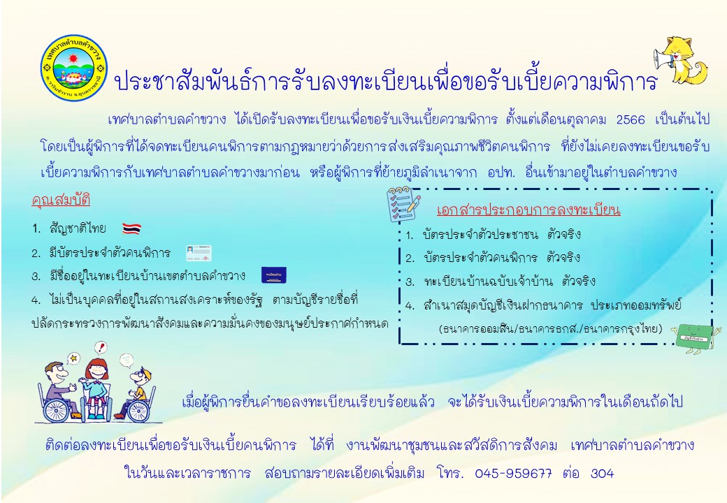 ประกาศรับลงทะเบียนคนพิการ เพื่อรับเบี้ยความพิการ ประจำปีงบประมาณ พ.ศ.2567