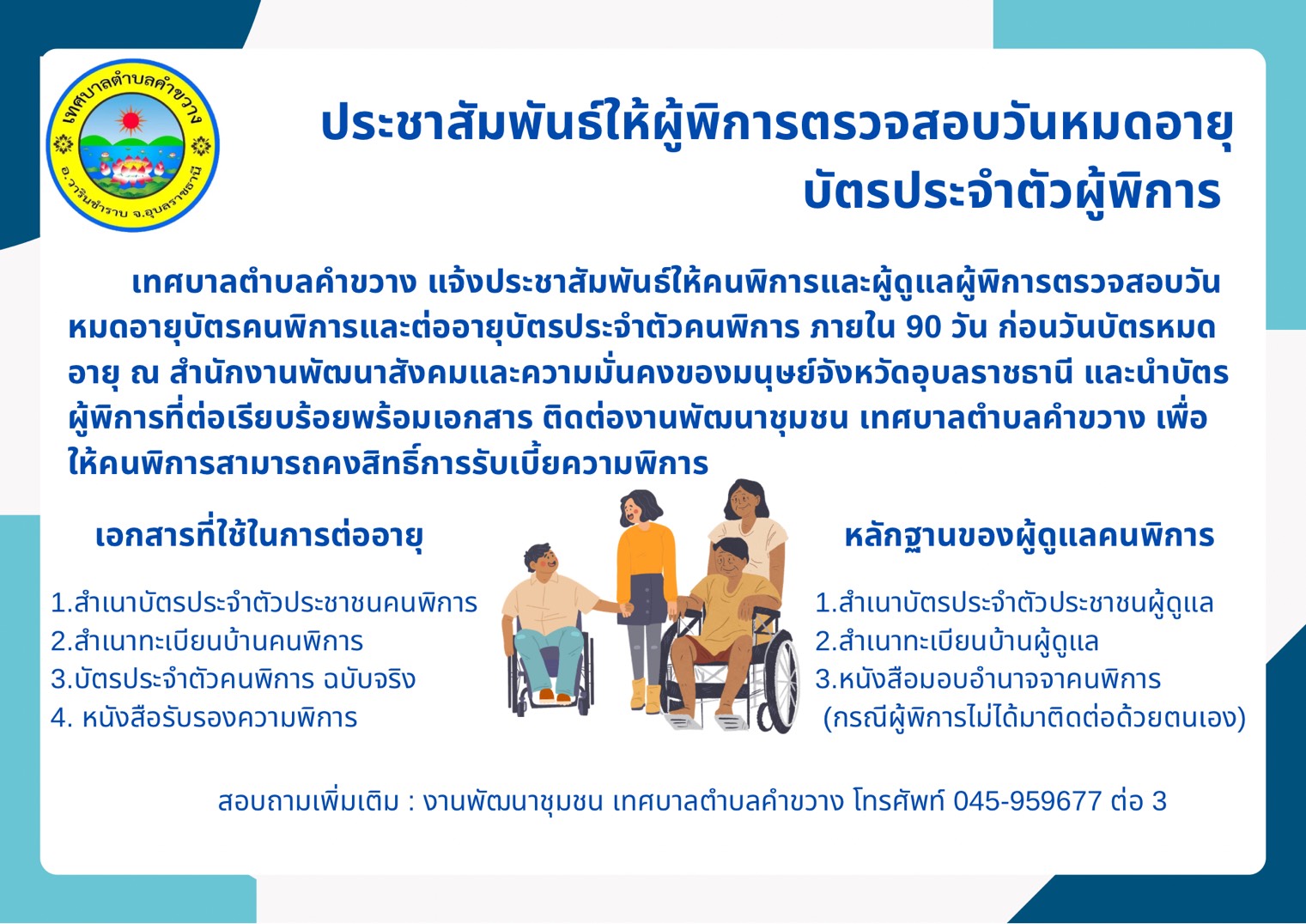 #แจ้งประชาสัมพันธ์ เทศบาลตำบลคำขวาง แจ้งประชาสัมพันธ์ให้คนพิการและผู้ดูแลตรวจสอบวันหมดอายุของบัตรประจำตัวคนพิการ กรณีบัตรประจำตัวคนพิการหมดอายุกรมบัญชีกลางจะระงับการจ่ายเบี้ยยังชีพความพิการจนกว่าจะดำเนินการต่ออายุบัตรประจำตัวคนพิการให้เรียบร้อย ดังนั้นหากตรวจสอบแล้วพบว่า บัตรประจำตัวคนพิการของตนใกล้หมดอายุ ให้เร่งดำเนินการต่ออายุทันที และให้แจ้งข้อมูลของบัตรประจำตัวคนพิการฉบับใหม่กับงานพัฒนาชุมชน เพื่อจะดำเนินการปรับปรุงฐานข้อมูลให้เป็นปัจจุบัน และจะได้รับสิทธิ์เบี้ยยังชีพความพิการต่อไป กรณีบัตรประจำตัวคนพิการหมดอายุ ชำรุด / สูญหาย หรือมีการเปลี่ยนแปลง - บัตรประจำตัวคนพิการจะมีอายุใช้งาน 8 ปี นับตั้งแต่วันออกบัตร เมื่อครบกำหนดแล้วคนพิการจะต้องยื่นคำขอขอมีบัตรประจำตัวคนพิการ ใหม่ ณ สถานที่ที่ให้บริการออกบัตรประจำตัวคนพิการ พร้อมเอกสารหลักฐานที่ใช้ในการขอมีบัตรประจำตัวคนพิการ ดังนี้ 1.สำเนาบัตรประจำตัวประชาชนของคนพิการ จำนวน 1 ฉบับ 2.สำเนาทะเบียนบ้านของคนพิการ จำนวน 1 ฉบับ 3.เอกสารรับรองความพิการจากสถานพยาบาลของรัฐ ใช้ฉบับจริงเท่านั้น หลักฐานของผู้ดูแลคนพิการ 1.สำเนาบัตรประชาชนของผู้ดูแล จำนวน 1 ฉบับ 2.สำเนาทะเบียนบ้านของผู้ดูแล จำนวน 1 ฉบับ 3.หนังสือรับรองการเป็นผู้ดูแลคนพิการ (ทั้งนี้ ผู้ดูแลคนพิการ ต้องเป็นผู้ซึ่งมีชื่ออยู่ในทะเบียนบ้านเดียวกันกับคนพิการ หรือเป็นผู้ดูแลคนพิการ ซึ่งคนพิการอาศัยอยู่ด้วยตามความเป็นจริง) สามารถติดต่อขอต่ออายุบัตรคนพิการได้ที่ สำนักงานพัฒนาสังคมและความมั่นคงของมนุษย์จังหวัดอุบลราชธานี (ศาลากลางหลังใหม่) หลังจากได้รับบัตรประจำตัวผู้พิการใบใหม่เรียบร้อยแล้วให้นำบัตรประจำตัวผู้พิการ พร้อมเอกสารติดต่อ งานพัฒนาชุมชนเทศบาลตำบลคำขวาง เพื่อคงสิทธิ์การรับเบี้ยความพิการต่อไป สอบถามรายละเอียดเพิ่มเติมได้ที่ : งานพัฒนาชุมชน 045 - 959 677 ต่อ 3