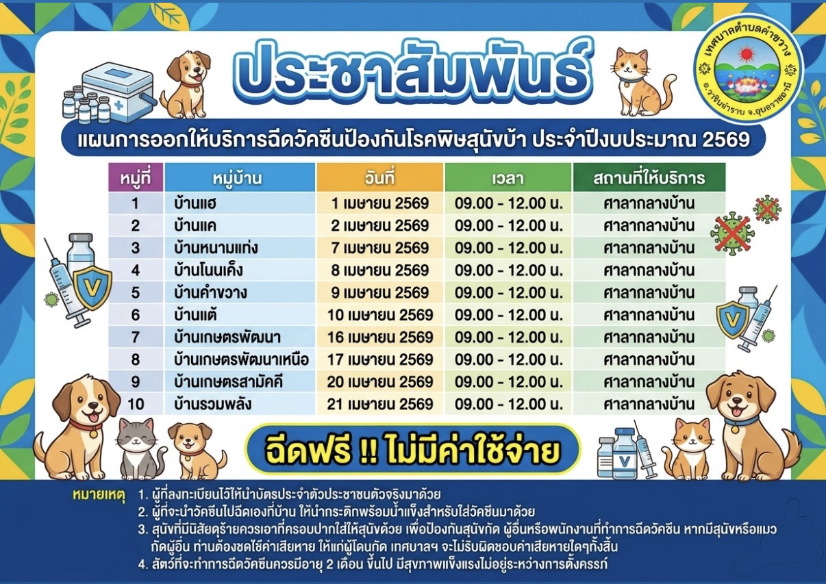 (ภายในเดือน เมษายน 2569) โดยเจ้าของสัตว์เลี้ยง นำสัตว์เลี้ยง พร้อมบัตรประจำตัวประชาชน มาติดต่อเจ้าหน้าที่ ตามวันเวลาและสถานที่ดังกล่าว