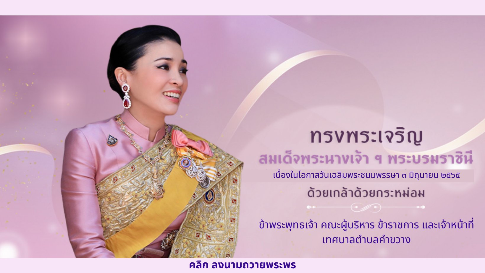 เทศบาลตำบลคำขวาง ขอเชิญประชาชนชาวไทย ร่วมลงนามถวายพระพร เนื่องในโอกาสวันเฉลิมพระชนมพรรษา สมเด็จพระนางเจ้าฯ พระบรมราชินี วันที่ ๓ มิถุนายน ๒๕๖๕ ตลอดเดือนมิถุนายน