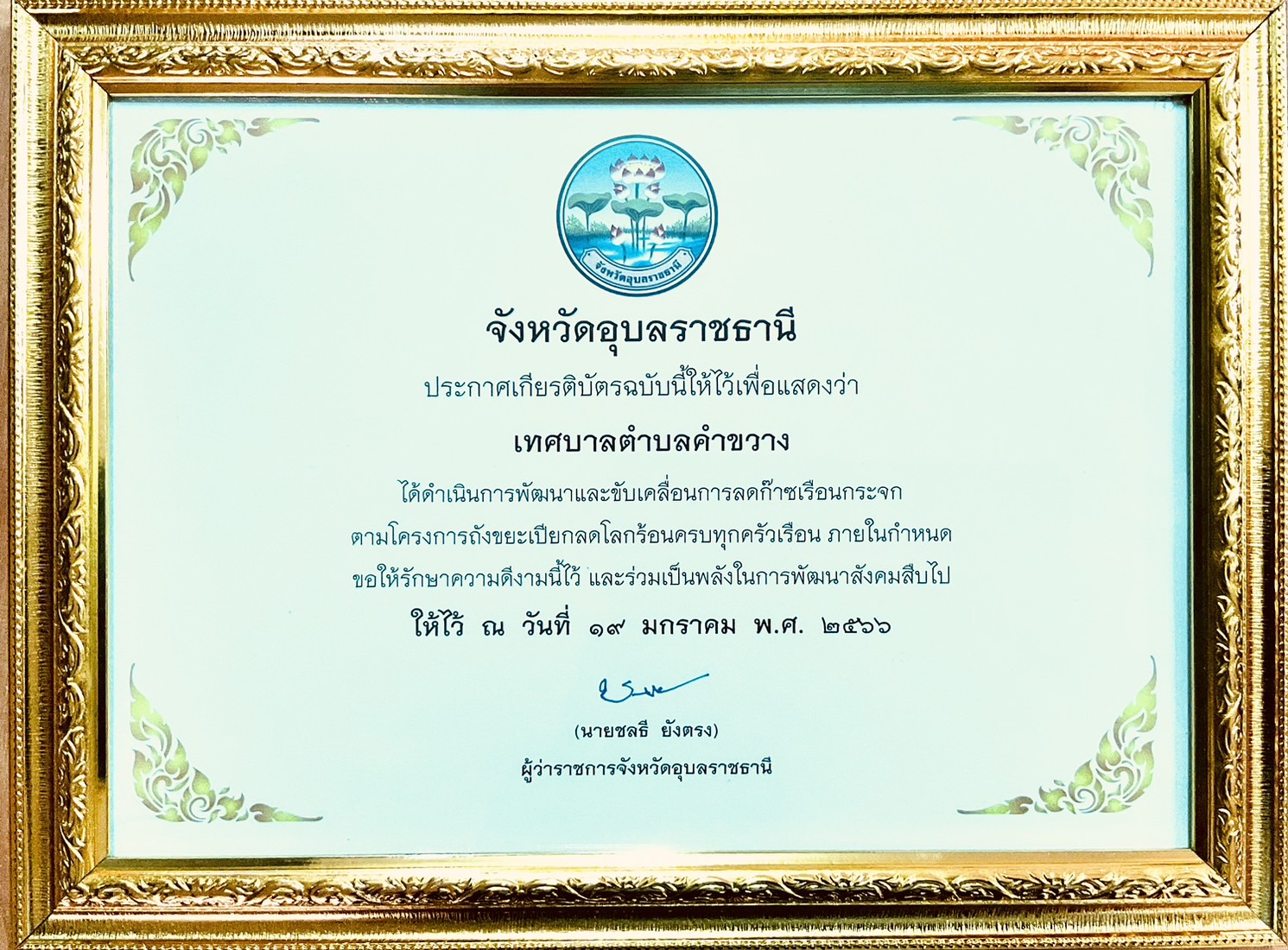 เทศบาลตำบลคำขวาง รับประกาศเกียรติบัตร ดำเนินการพัฒนาและขับเคลื่อนการลดก๊าซเรือนกระจกตามโครงการถังขยะเปียกลดโลกร้อนครบทุกครัวเรือน จากจังหวัดอุบลราชธานี